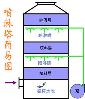 所謂的玻璃鋼噴淋塔,即采用噴淋的方式來達到凈化廢氣的效果。如下圖所示,由泵將比例噴淋塔底部的吸收液經由噴淋管送至塔體內部由噴淋嘴噴出并經由填料層與廢氣進行充分的接觸。